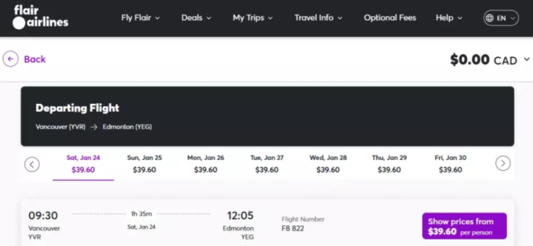 旅游旺季过去了,很多航空公司都推出特价机票。加拿大近期兴起“国内游”,有廉航“突发”推出超便宜特价机票,价钱平到你唔信,而且有很多出发日期可供选择。 乘搭天赋航空(Flair Airlines)从温哥华直飞埃德蒙顿,单程票价3.26元,连税也只是39.6元! 现在订购Flair机票,从温哥华飞埃德蒙顿,以明年1月下旬为例,在1月24日(周六)至30日(周五)期间任何一天出发,经航空公司官网订票,连税只需39.6元。
