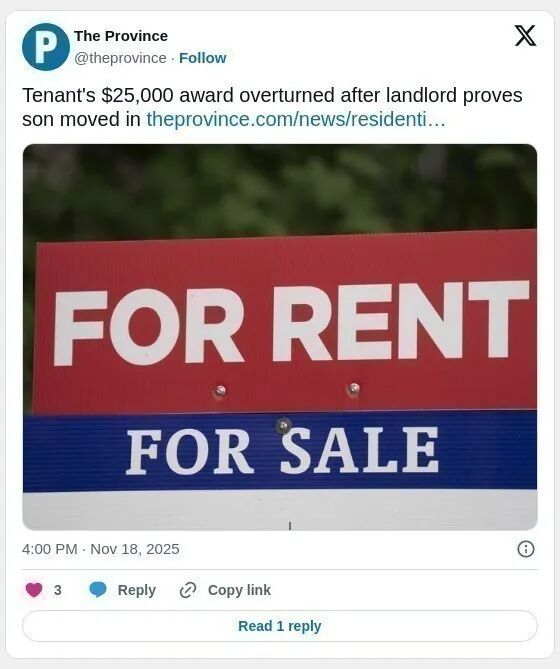 BC省最高法院推翻了一项之前裁定一名华裔房东需向前租客支付约25.000加元赔偿金的仲裁决定。不过,高院法官认定房东儿子确实在租客搬离后如计划入住该套租赁单位,仲裁员原判理由存在明显错误。 案件背景:房东以家人入住为由发出终止租约通知 根据BC省《住宅租务法》,若房东或其直系亲属计划自住,房东有权向租客发出终止租约通知。但若房东或家人未在合理时间内入住,或未连续居住至少12个月,则需向租客支付相当于12个月租金的赔偿。