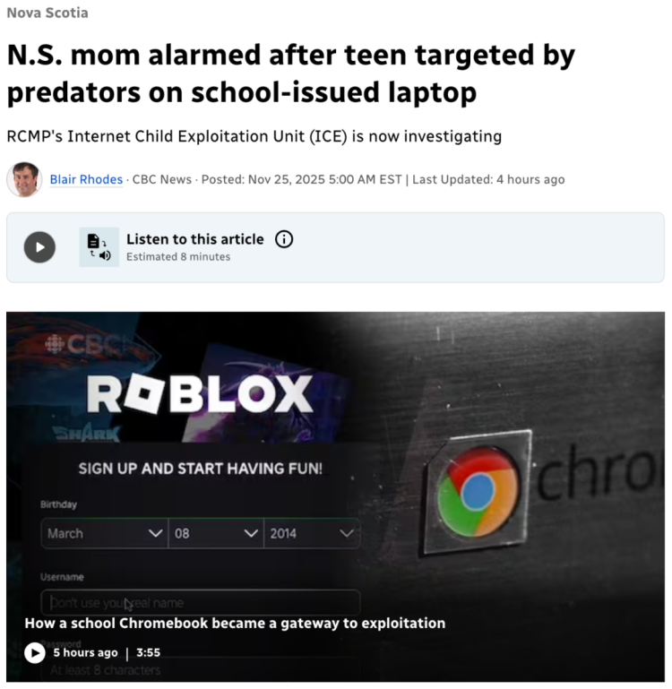 加拿大新斯科舍省(Nova Scotia)的一位母亲近日向媒体透露,她 14 岁的女儿通过学校发放的笔记本电脑,遭到网络骗子的有目标接触与诱导。目前,加拿大皇家骑警互联网儿童剥削小组(ICE)已介入调查。 这位母亲在十月份首次发现问题。当时她在女儿使用的学校 Chromebook 笔记本电脑上,发现了可疑的电子邮件和聊天记录。 “内容涉及非常露骨的性暗示、自残相关内容,还有一些与校外人员的对话,全部是通过她学校提供的电子邮箱进行的。”为保护女儿身份,CBC 新闻未公开这位母亲的姓名。