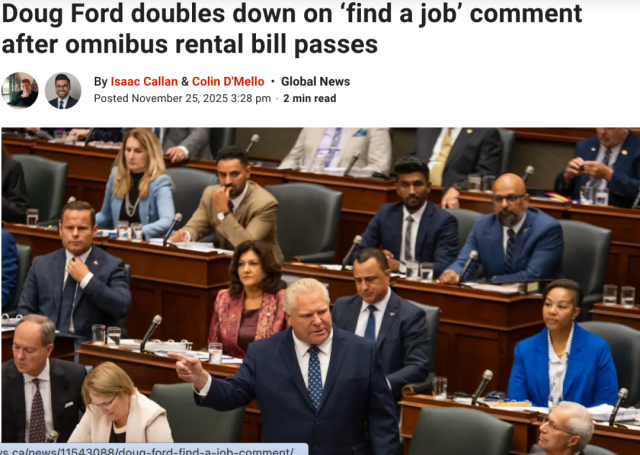 缩短的目标是减少案件的长期拖延,但同样表示各方需更快地去准备材料。 第三,因“房东自住”结束租约的补偿条件变化。 若房东以“自住”作为借口,只需提前至少120天告知租客,就可以免去原本应付出的一个月租金补偿。 反对者破防 面对这些改变,批评者以及租房者们认为,福特政府这是在挂羊头卖狗肉套,借着缩短审理时间的招牌,实际上是在简化赶走房客的程序。 在议会现场,对峙在投票时达到高潮。当租客维权组织成员在旁听席高呼“人民优先,不是利润!”时,安省省长Doug Ford直接回击:“去找份工作吧!”