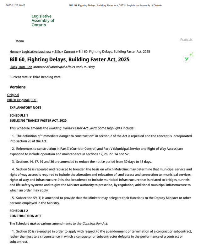 周一,安省议会大厦里面上演了一场激烈的对峙,在抗议者口号声此起彼伏中,安省省府以压倒性优势通过了Bill 60住房法案。 为什么会引发抗议?若要回答这个问题,我们要先搞明白Bill 60到底是什么。简单来说,该法案核心方向有两个方面:一是加速建房以及规划审批;二是调整房东跟租客之间纠纷处理的流程。 其中争议最大的部分,是法案对驱逐程序以及租赁听证流程的修正。依照法案的相关内容,重新设定多个和驱逐、听证事项相关的时间表,主要有下面三项: