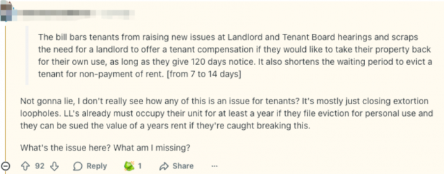 还有人直接表达疑惑:“老实说,我不明白这些条款为什么会被视为对租客不利。房东如果以自住为由驱逐,必须真的住满一年,否则可以被追讨一整年的租金赔偿。欠租驱逐从14天改成7天也只是程序调整。问题究竟出在哪里?我是不是漏看了什么?”