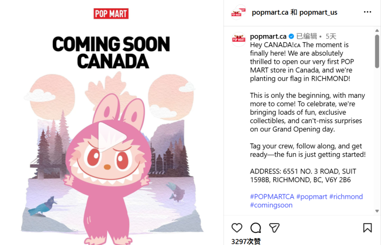 所以别看有人吐槽它“贵”,但消费者买的不是塑料,是喜欢,是情绪,是好看。正因为颜值够高、角色够有辨识度,它才从小玩具变成“真香”系列。 此外,泡泡玛特的海外版图已扩展至全球超25个国家和地区。这次将加拿大首店落户列治文,是一次精准落子——这里是全球华人最集中的区域之一,对泡泡玛特这种从国内火起的潮玩文化接受度最高。 同时Richmond Centre的人流、商场定位、消费风格,也与泡泡玛特的目标客群高度契合。目前门店仍处于试营业阶段,不少热门系列与新品预计将在正式开业后陆续到货。 |