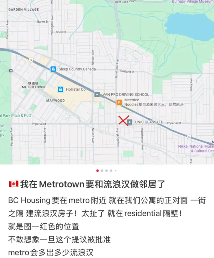 这几天,本拿比Metrotown的平静被一份文件打破了。政府计划在距离丽晶广场仅几分钟车程的地点,盖一栋给流浪汉和吸毒者住的楼。 消息一出,立刻在社交平台和街坊邻里里传开,华人圈反响尤其强烈。不少人感叹,建“毒窝”的风波,终究还是从列治文和素里开始,一路烧到了本拿比的中心。 商圈旁建收容所 根据官方文件,BC Housing正与本拿比市政府及Fraser Health合作,提议在5389 Imperial Street建设一栋支援性住房项目。