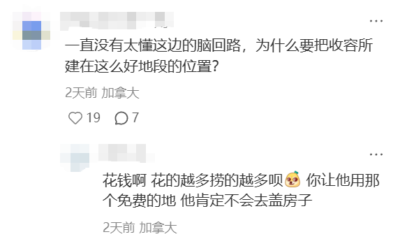 网友C质疑:“一直不太懂为什么要把收容所建在这么好的地段?” 网友D回应:“政府把收容所建在这么好的地段,不是因为地合适,而是因为花的钱多、项目预算高、能拿到更多拨款支持。”