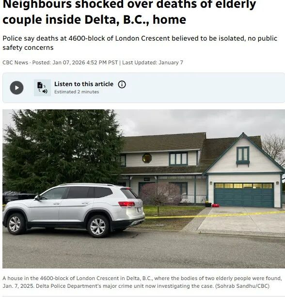 案件已交由三角洲警察局重大犯罪调查组负责调查。 根据CBC的报道,现场可以看到警员在一栋独立屋外执勤。 在该社区居住了30年的邻居默特尔·马宗(Myrtle Mazzon)表示,死者是一对七八十岁的夫妇。