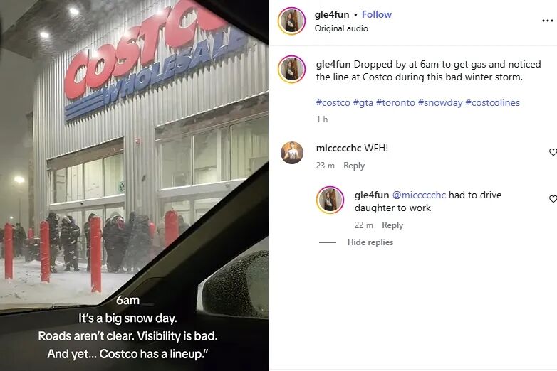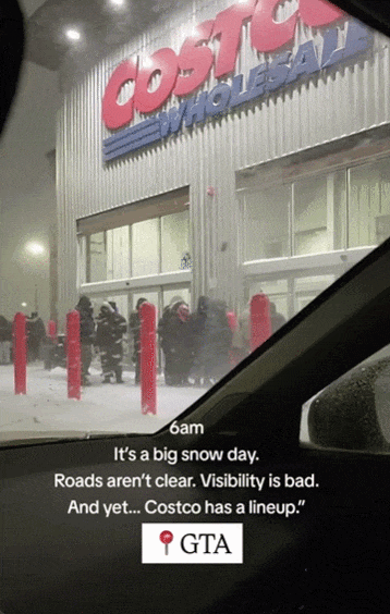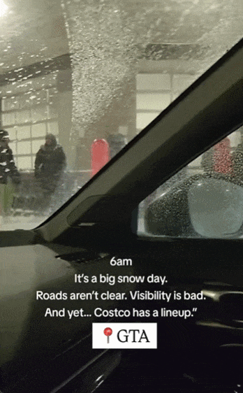 一场35cm大雪狂袭GTA,学校停课,DVP等高速公路封路,部分公共场所关闭,交通事故频发,全城陷入一片昏乱。 BUT!更让人震惊的是,多伦多一家Costco门口,天没亮就排队排疯了! 你们感受一下。 拍摄视频的网友@gle4fun表示,清晨6点去Costco加油,万万没想到,冬季风暴中,店门口已经有大批人排起了长队。 视频字幕写道:“早上6am,大雪天,道路难行,能见度很差,但是Costco门口排起了长队!“ 视频里可以看到,天还没亮,这些人穿着厚外套、顶着风雪,踩着积雪站在门口,很多人缩着脖,有人干脆把帽子拉到只露眼睛。 视频在社交媒体曝光后,网友们都直接看傻了。各种猜测,这些人到底为什么这么拼: “一定是排队换雪胎!” 无论是抢什么,这种天气,大家都最好别出门添乱了!安全第一! |