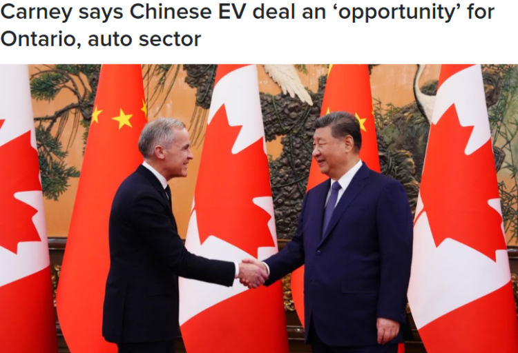 “更糟糕的是,通过降低中国电动车关税,这项严重失衡的协议可能会关闭加拿大汽车制造商进入美国市场的大门——而美国是我们最大的出口市场,这将伤害加拿大经济并导致失业,”福特说。 加拿大最大私营部门工会 Unifor 主席拉娜·佩恩(Lana Payne)在新闻稿中称,该协议是对已经陷入困境的加拿大汽车产业造成的“自残式伤害”。她指出,英国和巴西的经验表明,一旦允许中国进入汽车市场,中方企业会迅速夺取市场份额。 卡尼将这项协议描述为市场准入的试运行阶段,并表示加拿大希望在未来的汽车市场中具备竞争力。 “我们不想在2000年或2010年的市场里竞争,我们要在未来竞争。这才是为安大略省带来高质量就业的方式,”卡尼周日表示。 卡尼还强调,任何在加拿大生产的中国汽车,都必须符合加拿大的劳动标准。 卡尔顿大学国际事务教授芬·奥斯勒·汉普森(Fen Osler Hampson)表示,引入中国电动车将迫使其他电动车品牌降价竞争。 他说,49,000辆电动车是一个“相当大的销量规模”。 “中方必须向谨慎、警惕的加拿大消费者证明,这是一款好产品,并且加拿大有足够的基础设施来支持它们,”汉普森说。 汉普森表示,他曾驾驶过中国热门品牌比亚迪(BYD)的车型,并将其形容为“一辆仿版沃尔沃”。 作为降低汽车关税的交换条件,中国计划自3月1日起,将对加拿大油菜籽的关税从84%下调至15%,并在至少年底前取消对油菜粕、龙虾、豌豆和螃蟹的关税。 不过,协议中并未提及仍被征收100%关税的菜籽油,加拿大猪肉所面临的25%关税也未作调整。 加拿大汽车行业此前已受到美国关税冲击。美国总统唐纳德·川普(Donald Trump)曾表示,美国并不需要加拿大生产的汽车。 但川普对卡尼与中国达成协议表示赞赏。 “这正是他应该做的事,签署贸易协议对他来说是件好事。如果你能和中国达成协议,那就应该去做,”川普上周五表示。 上述匿名高级消息人士还证实,渥太华已提前向美国政府通报了在汽车领域的新政策方向,包括通知美国贸易代表杰米森·格里尔(Jamieson Greer)。 不过,格里尔本周警告称,“从长远来看,加拿大将为这项协议感到后悔。” 信息来源: https://toronto.citynews.ca/2026/01/18/mark-carney-says-chinese-ev-deal-an-opportunity-for-ontario-and-auto-sector/ |